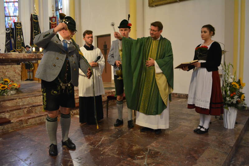 Stadtpfarrer Joachim Steinfeld segnet das Erinnerungsband für die Fahne, welches die „Inntaler“ Simbach dem Trachtenverein