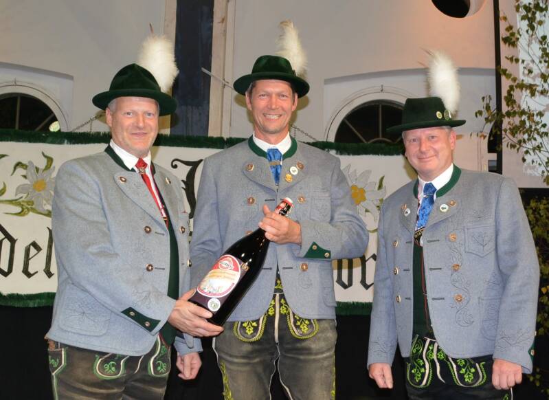 Schirmherr und Ehrenvorstand Klaus Schmid (Mitte) mit 1. Vorstand Christian Wimmer (rechts)und 2.Vorstand Sebastian Schmid (links) beim 100-jährigen Gründungsfest des Trachtenvereins „Edelweiß“ Antersdorf unter der Wittelsbacher Eiche auf dem Kirchenplatz